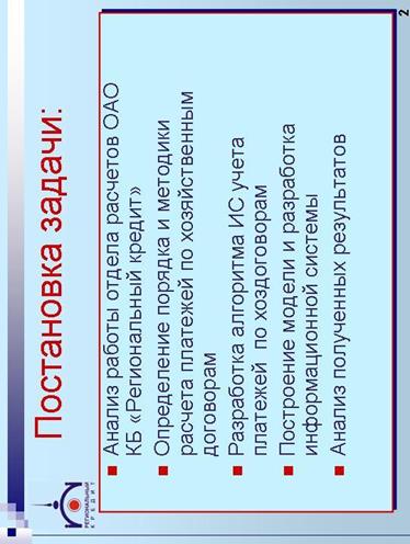 · ведется работа по внедрению ИС учета платежей по хоздоговорам в работу отдела расчетов ОАО КБ “Региональный кредит”;