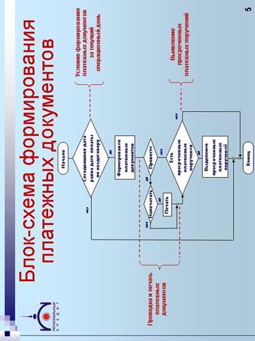 Здесь представлена блок-схема формирования платежных документов. Данный алгоритм применяется информационной системой ежедневно. Проверяется, наступил ли срок оплаты по хоздоговору. Если да, то формируются необходимые платежные документы: мемориальный ордер и платежное поручение. Также выясняется, проводить документ или нет, печатать его или нет. На этой же блок-схеме отражен такой важный момент, как выявление и выделение просроченных платежных поручений, которые действительны в течение 10 банковских дней с момента их выписки.