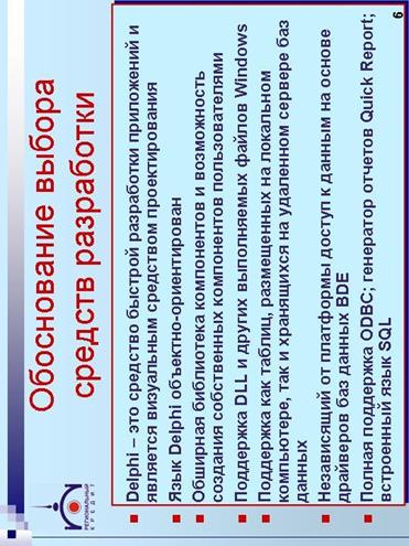 Исходя из требований, предъявляемых к ИС учета платежей по хозяйственным договорам ОАО КБ “Региональный кредит”, для реализации разработанного алгоритма был выбран универсальный язык программирования Delphi (пожалуйста, слайд № 6)