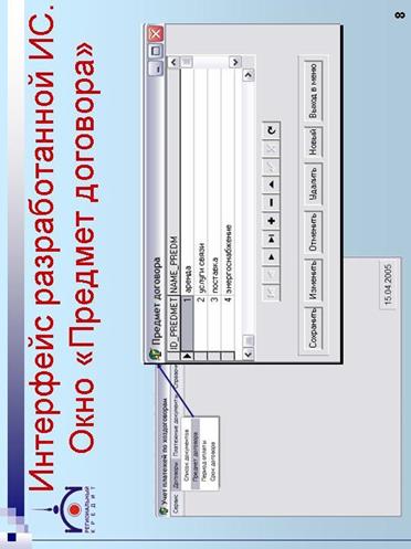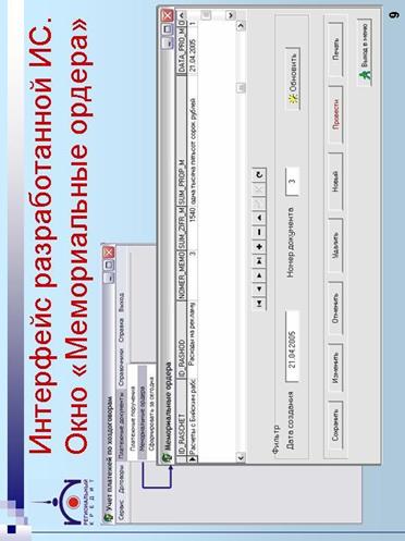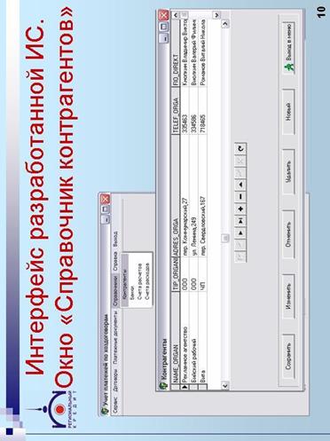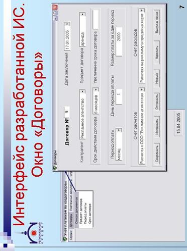 При разработке ИС учитывалось то, что основная работа в отделе расчетов ведется в системе IBSO. Поэтому было уделено большое внимание интерфейсу. Интерфейс разработанной ИС удовлетворяет всем параметрам интерфейса информационной системы IBSO.