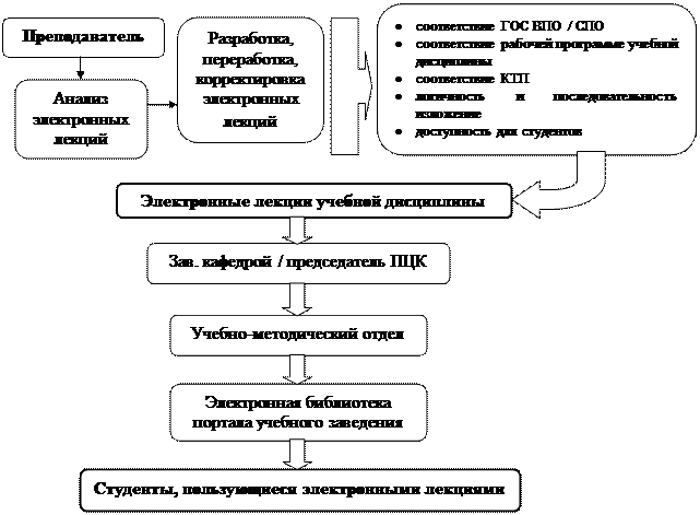 На основе анализа качества представленных лекций преподавателем принимается решение о необходимости либо их переработки (внесения существенных изменений в структуру лекций, их содержание), либо корректировки (незначительное изменение содержания). Итоговый вариант электронных лекций, полученный в результате работы, преподаватели сдают на проверку заведующему кафедрой / председателю предметно-цикловой комиссии, которые осуществляют их проверку на соответствие предъявляемым требованиям. Проверка проводится с целью оценки реализации образовательного стандарта, соответствия заявленных тем лекций рабочей программе учебной дисциплины, логичности и доступности изложения, эстетичности оформления. Далее заведующий кафедрой / председатель предметно цикловой комиссии предоставляет электронные лекции в учебно-методический отдел. Сформированные по специальностям комплекты электронных лекций учебно-методический отдел размещает на портале учебного заведения в разделе «Библиотека». На портале студенты получают возможность ознакомиться с электронной лекцией в удобное для него время. Детально порядок работы над электронной лекцией представлен на схеме 1.