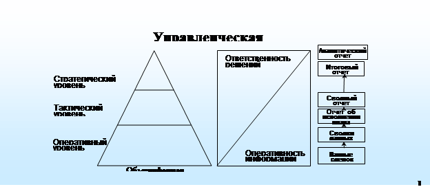 Система управленческих отчетов отражает принятую практику управления организацией. Руководству высшего уровня рекомендуется представлять наименее подробные отчеты. По мере движения вниз по управленческой структуре отчеты предлагается делать более детализированными, но их область охвата должна сужаться. Объем информации, предоставляемый для анализа руководителю каждого подразделения, должен быть для всех примерно одинаковым. Иерархия управленческой отчетности показана на рисунке 1.