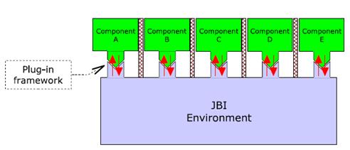 Рисунок 1 показывает концепцию динамического подключения (plug-in) JBI на абстрактном уровне. JBI предоставляет определенные интерфейсы для механизма plug-in. Компоненты не взаимодействуют напрямую друг с другом, а пользуются механизмом, ориентированным на работу с сообщениями, описанный с помощью стандартного языка. Это все составляет самодостаточную модель взаимодействия сервисов, которая позволяет подключать и вызывать компоненты.