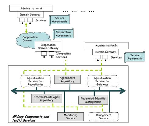 Соглашение Сервисов описывает двухсторонние отношения с целью предоставления и вызова сервисов. Множество административных процессов не могут ограничивать использованием ресурсов одной администрации, и поэтому вовлекают в свои процессы другие. Домен Кооперации – формализации желания различных субъектов объединиться для образования композиционного сервиса, который позволит автоматизировать административные процессы. Внутри Кооперационного Домена можно выделить ответственного координатора, задачей которого является координация вовлеченных субъектов, а также композитных приложения, образованных посредством Домена Кооперации. Домен Кооперации можно рассматривать как проводник сервиса, действующий как обычный домен какой-либо администрации. Главное различие в способе, которым эти сервисы были спроектированы и разработаны: в Домене Кооперации они построены композицией и интеграцией простых сервисов, предложенных вовлеченными администрациями, тогда как для обычного домена поддержка сервиса полностью связана с приложением, которое полностью под контролем одной администрации.