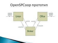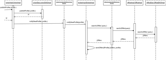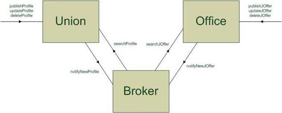 В качестве основы для прототипа OpenSPCoop было выбрано приложение «Биржа Труда». 3 сервиса образуют простейшую клиент-серверную архитектуру. «Союз Работников» принимает заявки безработных граждан ищущих работу. Каждый ищущий может разместить (publishProfile), обновить (updateProfile) или же удалить свою анкету (deleteProfile). В то же самое время, «Офис Компаний» дает возможность компаниям размещать свои предложения об открытых вакансиях. «Брокер» служит посредником между «Союзом Работников» и «Офисом Компаний» и позволяет каждой анкете безработного быть проверенной на все предложения компаний (searchJOffer) и наоборот – каждой заявке компании проверить все анкеты безработных (searchProfile) (Рисунок 3):
