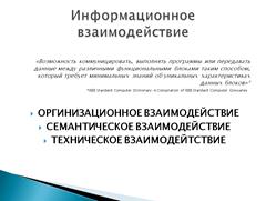 Этот аспект взаимодействия покрывает технические проблемы связывания компьютеров и сервисов. Он включает в себя такие понятия как: открытые интерфейсы, взаимодействие сервисов, интеграция данных, представление данных и их обмен, доступ и безопасность.