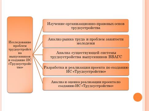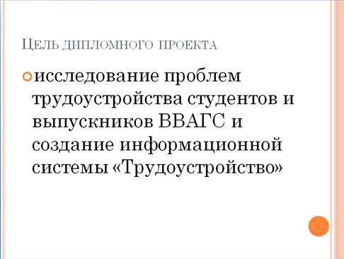 Например, целью дипломного проекта является исследование проблем трудоустройства студентов и выпускников ВВАГС и создание информационной системы «Трудоустройство».