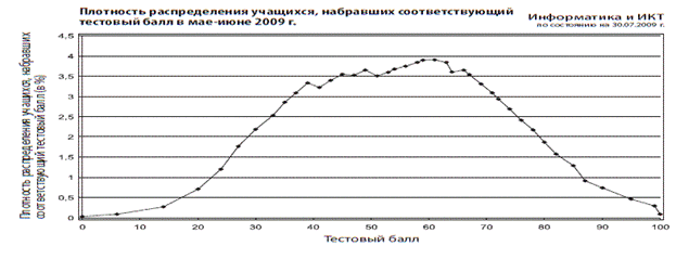 ЕГЭ по информатике и ИКТ в 2009 г. сдавался, как и в прошлые годы, выпускниками по выбору, но в условиях новых нормативных документов, определяющих порядок проведения ЕГЭ: в отличие от предшествующих лет оценка за экзамен не переводилась из 100-балльной в пятибалльную шкалу. Рособрнадзором была установлена минимальная граница в 37 тестовых баллов, которую не преодолели 10,97% сдававших экзамен (в 2008 г. неудовлетворительную оценку получили 11,3% экзаменовавшихся, в 2007 году 9,7%). Максимальную оценку в 100 баллов получили 62 человека (0,09% участников экзамена). В Таблице 1 приводится распределение участников экзамена по группам на основании набранных баллов.