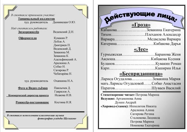 В нём принимали участие учащиеся…класса: в роли Кабановой….,Тихон…, Варвара.., Катерина.