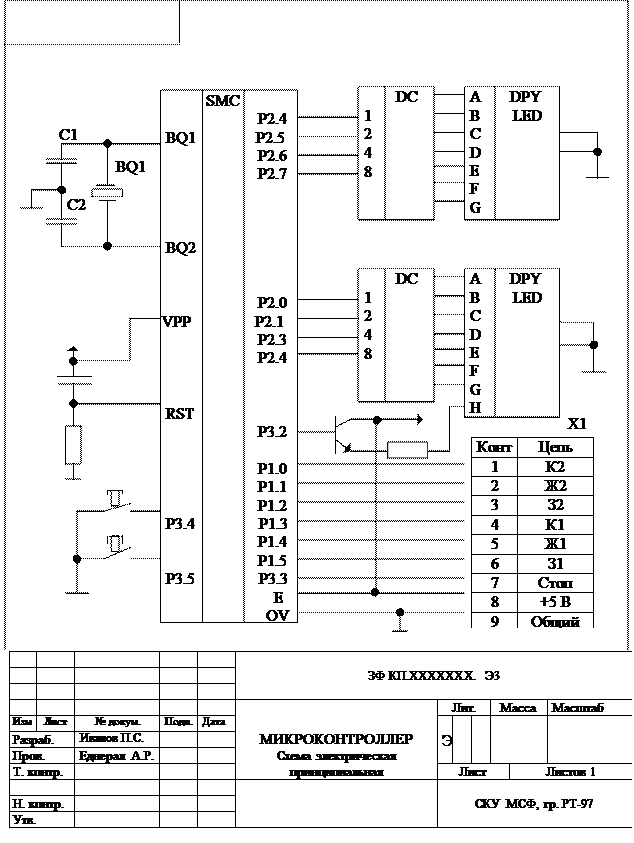 Электрическая структурная схема (код схемы Э1) разъясняет процессы, происходящие в отдельных структурных узлах и в устройстве в целом. Она строится для оптимального варианта проектируемого устройства, который необходимо выбрать из нескольких возможных. На этом этапе однозначно определяется алгоритм работы устройства, функции отдельных цифровых и аналоговых блоков. Выбирается тип микропроцессора. Определяется набор функций, которые удобно реализовать программным путем, и набор функций, требующих для реализации дополнительных цифровых элементов (контроллера клавиатуры/дисплея, программируемого таймера, расширителей ввода/вывода, счетчиков, мультиплексоров и т.п.). Степень детализации должна быть достаточной для того, чтобы на последующих стадиях можно было производить независимую разработку аппаратных и программных средств микропроцессорной системы.