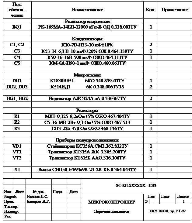 Латинский алфавит определяет последовательность расположения обозначений в перечне элементов (его код - ПЭ3): конденсаторы (С1, С2, С3...С5), аналоговые микросхемы (DA1, DA2...DA8), цифровые микросхемы (DD1, DD2...DD6), резисторы (R1, R2...R5, R6), полупроводниковые приборы (VD1, VT1...VT3), разъем (XP1).