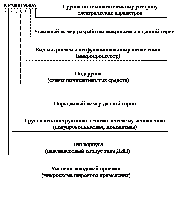 Условное обозначение микросхемы состоит из трех- или четырехзначного обозначения серии микросхем, двух букв, означающих подгруппу и вид микросхемы, и порядкового номера разработки микросхемы.