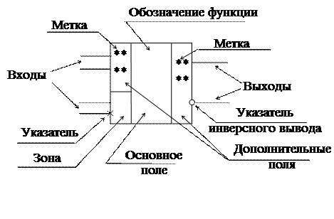 УГО элементов (узлов) аналоговой и цифровой техники строят на основе прямоугольника. В самом общем виде УГО может содержать основное и два дополнительных поля, расположенных по обе стороны от основного. Размер прямоугольника по ширине зависит от наличия дополнительных полей и числа помещенных в них знаков, по высоте – от числа выводов, интервалов между ними и числа строк информации в основном и дополнительных полях. В основном поле указывают функциональное назначение элемента, а в дополнительных – метки, обозначающие функции или назначение выводов. В местах присоединения линий-выводов изображают специальные знаки (указатели), характеризующие их особые свойства (инверсные, динамические и т.д.). Группы выводов могут быть разделены увеличенным интервалом или помещены в обособленную зону. Согласно стандарту, ширина основного поля должна быть не менее 10 мм, дополнительных – не менее 5 мм, расстояние между выводами – 5 мм. Выводы элементов схемы делятся на входы, выходы, двунаправленные выводы (служат как для ввода, так и для вывода информации) и выводы, не несущие информации (например, для подключения питания, внешних RC