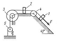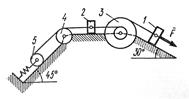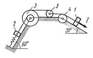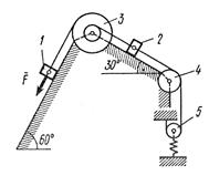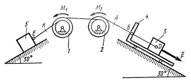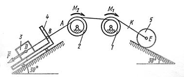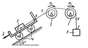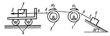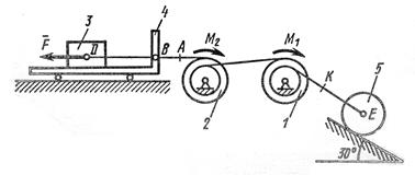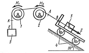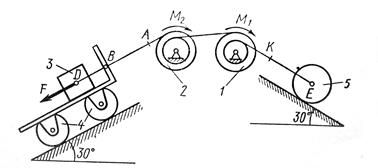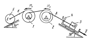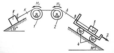 На систему кроме сил тяжести действует сила , приложенная к телу 3 или 4 (если тело 3 в систему не входит, сила приложена в точке В к тележке), и пары сил с моментами , , приложенные к блокам 1 и 2; когда , направление момента противоположно показанному на рисунке.