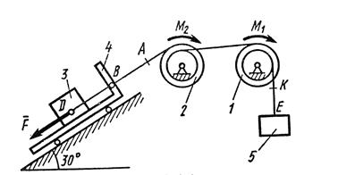 . Механическая система (рис. Д3а) состоит из сплошного однородного цилиндрического катка 1, подвижного блока 2, ступенчатого шкива 3 с радиусами ступеней и и радиусом инерции относительно оси вращения , блока 4 и груза 5 (коэффициент трения груза о плоскость равен ). Тела системы соединены нитями, намотанными на шкив 3. К центру Е блока 2 прикреплена пружина с коэффициентом жесткости ; ее начальная деформация равна нулю. Система приходит в движение из состояния покоя под действием силы , зависящей от перемещения s точки ее приложения. На шкив 3 при движении действует постоянный момент М сил сопротивления.
