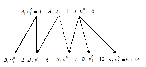 Перед тем ознакомиться с процессом решения задачи, отметим, что нуль в последующих таблицах будет иметь другое толкование в сравнении с толкованием в таблице 5.5. Также обратим внимание, что строки последующих таблиц будут обозначаться привычным индексом а столбцы - Сделав эти предварительные замечания, перейдем к таблице 5.6, которая является копией таблицы 5.3.