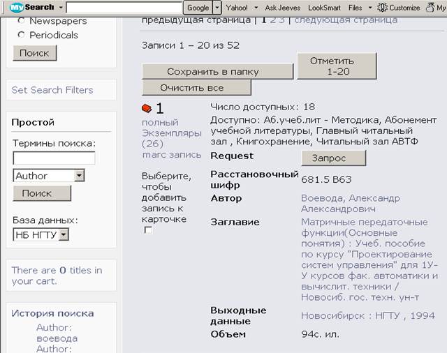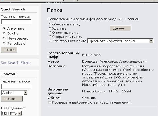 Все записи, отобранные в течение Простого, Комбинированного или Экспертного поиска, можно сохранить в Папке читателя.