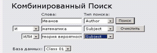 поиск – поиск по двум или трем поисковым элементам. В комбинированном поиске поисковые критерии задаются в двух или трех строках запроса. В каждой строке может быть выбран один из возможных типов поиска. Строки объединяются с помощью логических операторов (и/или/не) :