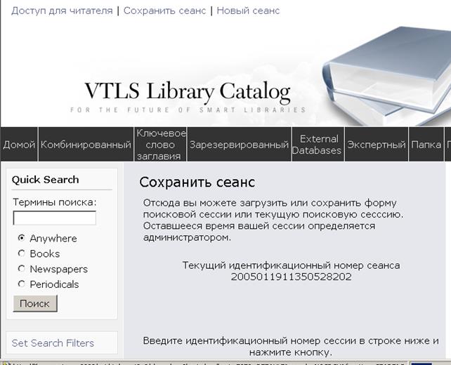 Электронный каталог Virtua позволяет сохранить сеанс (Историю поиска и содержимое Папки) для того, чтобы использовать результаты поиска в дальнейшем.