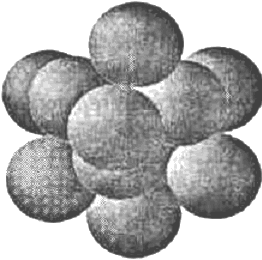 структуре жидкости: каждая молекула окружена соседними, которые располагаются вокруг нее почти так же, как и в кристалле того же вещества. Однако во втором слое появляются отклонения от упорядоченности, которые увеличиваются по мере отдаления от первоначально взятой молекулы. Иначе говоря, отступление от правильного расположения по мере удаления от данной молекулы систематически возрастает и на большом расстоянии становится очень значительным – в жидкости существует ближний порядок