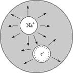 . В рассматриваемой нами модели могут реализоваться три качественно различных случая, отвечающих трем различным типам состояний валентного электрона: с двумя центрами (ионная пара), с одним центром и поверхностным состоянием (рис. 10). Состояния с двумя центрами имеют два центра сольватации (ион металла и валентный электрон), находящихся внутри кластера. Очевидно, что состояния с двумя центрами должны больше подходить для больших кластеров, т. к. атом щелочного металла распадается внутри макроскопического объема жидкости на ион и сольватированный электрон. Для небольшого числа полярных молекул электрон, вероятно, образует состояние, которое локализуется на ионе металла, в то время как поверхностные состояния электрона образуются, когда взаимодействие между полярными молекулами и ионом металла преобладают по сравнению с взаимодействием, между валентным электроном и ионом.