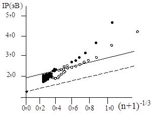 8. Для всех рассмотренных видов состояний потенциал ионизации возрастает с увеличением размера кластера. На рис. 11 изображен график размерной зависимости потенциала ионизации для нейтральных аммиачных кластеров: кружками отмечены экспериментальные данные, сплошная линия показывает асимптотическую размерную зависимость для электронного состояния с одним центром, для которого значение постоянной А