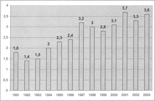 Чем выше уровень абитуриентов, тем выше и будущий уровень образования студентов. Убедительной иллюстрацией тому служит положение, сложившееся на химическом факультете Московского университета к началу 90-х годов, когда приток абитуриентов сократился до критического уровня, а конкурс приблизился к черте, за которой можно было уже отменять вступительные экзамены (рис. 1).