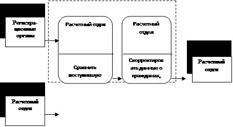 От организаций города в отделение Пенсионного фонда поступает информация о сотрудниках организации и декларации о пенсионных отчислениях, произведенных этими организациями. Эта информация после проверки и обработки передается в головное отделение Пенсионного фонда (для начисления средств на именные накопительные пенсионные счета). Из головного отделения Пенсионного фонда каждый месяц поступает информация о начисленных пенсиях, которая затем используется для выплаты пенсий распределяющими организациями (почтовые отделения, банки, социально-патронажные службы). Из налоговых органов для целей контроля передается информация о полученных гражданами доходах.