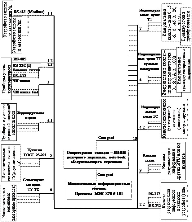 9. Создание операторских станций на обслуживаемых контролируемых пунктах (подстанциях) с введением в ПЭВМ операторской станции микро АРМ и микро ОИК. База операторской станции – устройство КП-микро ИУТК «Гранит-микро», реализующее независимую работу ПЭВМ и информационный обмен с ПУ. В состав операторской станции вводятся, по условиям применения, модули для информационного обмена с современными микропроцессорными устройствами защиты, поддерживающими интерфейс RS-485 и протокол MODBUS.