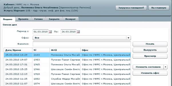 Под заголовком расположены «закладки», соответствующие состояниям, определённым для данного варианта услуги. Для услуги «регистрационный учёт по месту пребывания» предусмотрены следующие типы вкладок: «Подано», «Принято», «Закрыто», «Возврат». Первой закладкой всегда открывается закладка состояния «Подано».