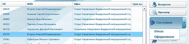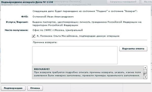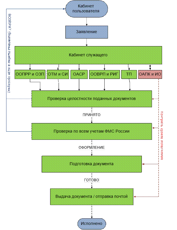 При поступлении заявления в территориальный орган уполномоченный сотрудник проверяет заявление на наличие в нем грамматических и технических ошибок и в течение 1 рабочего дня осуществляет проверку заявителя по учётам ФМС России и территориального органа на предмет выявления оснований для отказа в приёме заявления к рассмотрению. Если ошибок не обнаружено делу присваивается состояние «ПРИНЯТО».