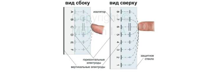 Каждый электрод, будучи проводником, имеет некоторую электрическую емкость. Можно сказать, что в данном случае мы имеем дело со своеобразным конденсатором, одной обкладкой которого является сам электрод, а другой - любой проводящий ток предмет, например, человек. Все горизонтальные электроды (и все вертикальные) имеют одинаковые размеры, форму и проводимость, поэтому, при отсутствии вблизи экрана проводящих предметов, их емкости приблизительно равны. Микроконтроллер последовательно подает на каждый из электродов импульс напряжения и измеряет амплитуду возникающего импульса тока, который заряжает «конденсатор».