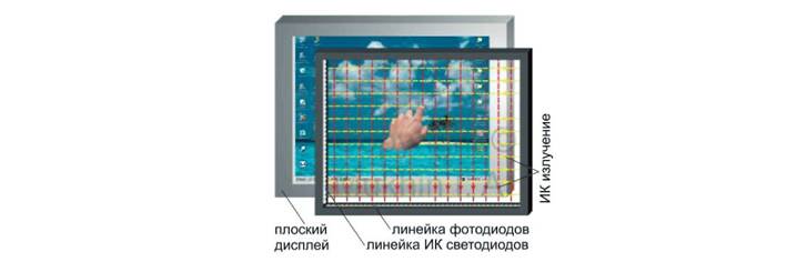 Каждому светодиоду соответствует свой фотодиод. Работает такая оптическая пара следующим образом. При подаче напряжения на светодиод он излучает невидимый для человека инфракрасный свет в пределах очень небольшого телесного угла, чтобы попасть на «свой» фотодиод «не задеть» соседние. Любое препятствие, например, касающийся экрана палец руки, частично или полностью перекрывающее световой луч, приводит к уменьшению или прекращению электрического тока через соответствующий фотодиод. Это изменение фиксируется микроконтроллером, позволяя вычислить координату касания с высокой точностью. Обычно светодиод (и, соответственно, фотодиод) в линейке имеет размеры порядка 2,5 мм, то есть на каждый квадратный сантиметр панели приходится четыре горизонтальных и четыре вертикальных сканирующих луча. Однако механизмы интерполяции, используемые микроконтроллером, позволяют вычислять положение препятствия с большей точностью. Инфракрасный сенсорный экран выполняется в виде рамки, которая не имеет никаких стекол или прозрачных пленок. Поэтому изменение яркости, контраста и цветопередачи изображения, а также появление дополнительных бликов исключены, что является несомненным достоинством экрана. Инфракрасная технология не лишена ряда недостатков. Применение в качестве отображающего устройства жидкокристаллических панелей нежелательно, так как касание их поверхности может привести к повреждению TFT-транзисторов и появлению «мертвых» точек, (которые всегда либо включены, либо выключены). Рамка сенсорного экрана зачастую не прилегает к экрану дисплея вплотную, а находится на некотором расстоянии, при этом вследствие параллакса становятся заметными ошибки определения координат по углам. Устройство имеет невысокую надежность, что связанно, во-первых, с небольшим сроком службы ИК-светодиодов, а во-вторых, с особенностями конструкции - оптопары боятся пыли, загрязнений и конденсата. Попадание прямого солнечного света вызывает сбои в работе. Кроме того, такие экраны имеют самую высокую стоимость. Применяются ИК-экраны обычно в образовательных учреждениях -в качестве интерактивных панелей большого размера, и в игровых автоматах.