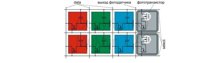 Другой инновационной технологией является применение LCD-панелей со встроенным оптическим сенсорным экраном. Работает устройство следующим образом. Для упрощения и удешевления всей конструкции применяется ЖК-экран, каждый пиксель которого состоит из четырех субпикселей (красного, зеленого, синего и белого). Последовательно с TFT-транзистором белого субпикселя включается фототранзистор (рис.11).