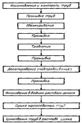 Технологическая схема цинкования труб «сухим» способом состоит в следующем . После изготовления и контроля трубы поступают в отделение цинкования На поверхности трубы не должно быть дефектов (например значительных рисок, вмятин, следов маркировки),ухудшающих их товарный вид. Концы труб должны быть обрезаны под прямым углом и не иметь заусенцев.