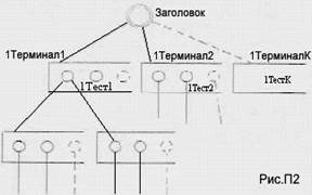 Каждое из возможных заданий терминала рассматривается в свою очередь как фрейм следующего по рангу уровня (субфрейм) со своими терминалами, которые представляются на рисунке дочерними вершинами заданий - субфреймов и обозначаются прямоугольниками. Каждый из этих терминалов низшего ранга так же, как и терминалы фрейма верхнего ранга, отождествляется со своим тестом. Задания терминалов следующего по рангу уровня, также обозначенные кружками, являются более мелкими конкретизированными элементарными действиями. Каждое из них соответствует значению теста. Если и эти задания еще не являются достаточно конкретными, то фрейм может иметь еще один более низкий по иерархии уровень.