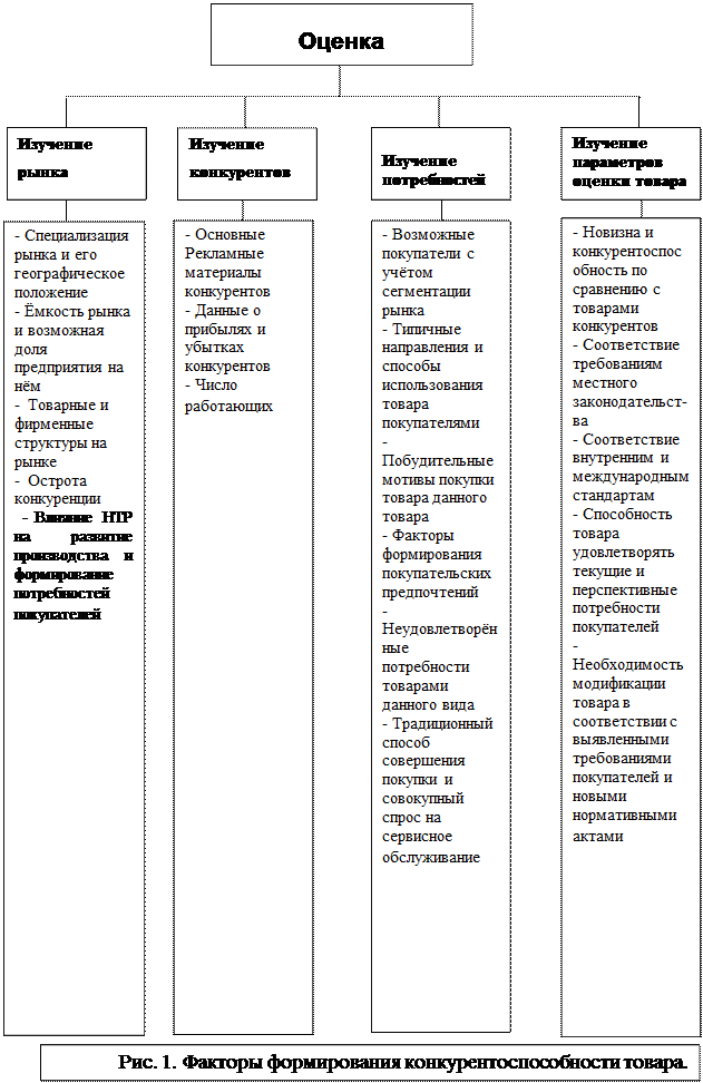 Известно, что потребитель из двух однородных товаров, как правило, выберет тот, что дешевле, а при одинаковой цене — тот, чьи потребительские свойства выше. В борьбе за конкурентоспособность товара изготовитель всегда должен помнить эти правила и руководствоваться ими. В целом же оценка конкурентоспособности товара, как видно из рисунка 1, включает в себя изучение рынка, конкурентов, потребностей покупателей и параметров оценки товара. В мировой практике количественная оценка конкурентоспособного товара складывается из трех этапов: