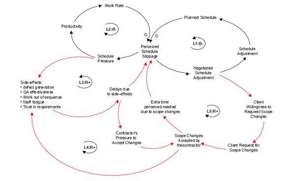 Пожалуй, самый новый метод моделирования проекта, позволяющий наиболее комплексно описать проект и с помощью имитационного моделирования процессов, протекающих в проекте, определить источники риска и даже количественно описать их. Пример описания проекта по разработке ПО с использованием системной динамики, ориентированный на моделирование изменения требований к разрабатываемому ПО: