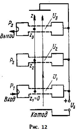 перед входным резонатором. Изменение кинетической энергии электронов в ускоряющем поле между катодом и входным резонатором равно изменению потенциальной энергии eU0