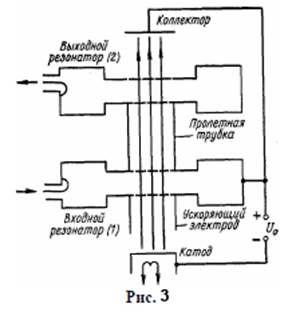 - клистрон, в котором электроны последовательно пролетают сквозь зазоры объёмных резонаторов (ОР). В зазоре входного ОР происходит модуляция скоростей электронов: электрическое поле в нем периодически полпериода ускоряет, а следующие полпериода замедляет движение электронов. В пространстве дрейфа ускоренные электроны догоняют замедленные, в результате чего образуются сгустки электронов. Проходя сквозь зазор выходного ОР, сгустки электронов взаимодействуют с его электрическим полем СВЧ, большинство электронов тормозится и часть их кинетической энергии преобразуется в энергию колебаний СВЧ. Идея преобразования постоянного потока электронов в поток переменной плотности за счёт того, что ускоренные электроны догоняют замедленные, рассматривалась советским физиком Д. А. Рожанским в 1932, метод получения мощных колебаний СВЧ, основанный на этой идее, был предложен совместно советским физиком А. Н. Арсеньевой и немецким физиком О. Хайлем в 1935, первые конструкции пролётных Клистрон были предложены и осуществлены в 1938 американскими физиками В. Ханом, Г. Меткалфом и независимо от них Р. Варианом и З. Варианом. Большинство пролётных клистронов являются многорезонаторными усилительными клистронами. Промежуточные ОР, расположенные между входным и выходным ОР, дают возможность расширить полосу пропускания частот, повысить кпд и коэффициент усиления. Усилительные клистроны выпускаются для работы в узких участках частот дециметрового и сантиметрового диапазонов волн с выходной мощностью от нескольких сотен Вт до 40 МВт в импульсном и от нескольких Вт до 1 МВт в непрерывном режиме работы. Коэффициент усиления клистрона обычно от 35 до 60 Дб, кпд от 40 до 60%, полоса пропускания менее 1% в непрерывном режиме и до 10% в импульсном режиме. Основные области их применения: доплеровская радиолокация, связь с искусственными спутниками Земли, радиоастрономия, телевидение (клистрон непрерывного режима работы) и линейные ускорители элементарных частиц, оконечные усилители мощности радиолокационных станций дальнего действия и высокой разрешающей способности (клистрон импульсного режима работы). Небольшую часть выпускаемых промышленностью пролётных клистронов составляют генераторные клистроны непрерывного режима работы. Обычно они имеют 2 ОР. Небольшая доля мощности колебаний СВЧ, создаваемых во втором ОР, передаётся через щель связи в первый ОР для модуляции скоростей электронов. Их выходная мощность примерно от 1 до10 Вт, кпд - менее 10%. Генераторные клистроны применяются главным образом в параметрических усилителях, радиомаяках сантиметрового и миллиметрового диапазонов волн. Отражательный клистрон