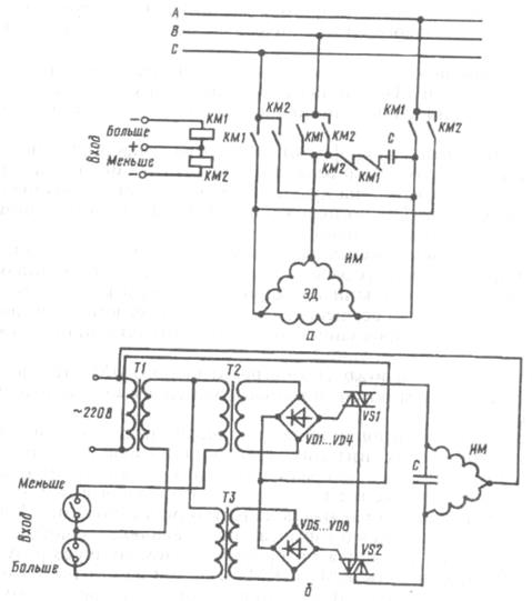 Основу устройства составляют два тиристорных ключа на симисторах VS1 и VS2, которыми управляют с помощью сигналов «Больше» — «Меньше», вырабатываемых регулятором или оператором. Каждый из тиристорных ключей включен в цепь питания одной из статорных обмоток электродвигателя.