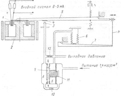 При установившемся режиме постоянный ток, проходя по катушке 1, укрепленной на основном рычаге 5, создает усилие втягивания катушки в зазор постоянного магнита 2, которое уравновешивается на рычажной системе при определенном давлении в сильфоие обратной связи 6.
