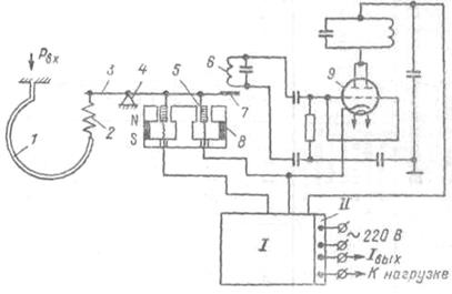 Измерительным элементом преобразователя является манометрическая трубчатая одновитковая пружина 1 (рис. 4). Преобразование перемещения ее конца в усилие осуществляется с помощью спиральной пружины 2, которая укреплена на рычаге 3, вращающемся вокруг оси 4. На рычаге 3 укреплен также медный диск 7, который находится в высокочастотном поле плоской катушки 6, входящей в базовый контур генератора 9. Генератор выполнен двухконтурным по схеме с общим коллектором. При перемещении коромысла изменяются параметры базового контура, что приводит к изменению режима генератора. Изменение режима генератора вызывает изменение постоянной составляющей коллекторного тока и тока базы, а следовательно, и выходного тока. В цепь коллектора включена катушка обратной связи 5, укрепленная на рычаге 3 в поле постоянного магнита 8. Выходной ток, обтекая катушку 5, создает момент обратной связи, противоположный моменту, создаваемому пружиной 2, вследствие чего коромысло будет перемещаться до наступления нового состояния равновесия.