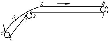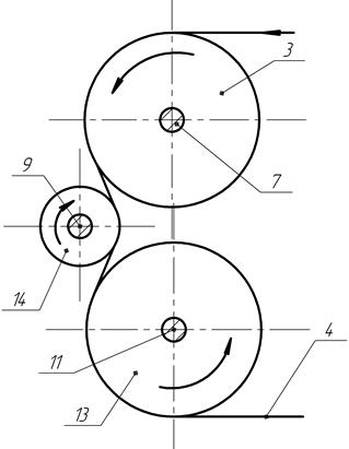 Барабан 3 приводится во вращение от вала 7; барабан 14 – от вала 9; барабан 13 – от вала 11. Барабаны 3 и 13 вращаются с одинаковой частотой, но имеют разный диаметр: > . Разность составляет 20…30 мм. Поскольку линейная скорость по средней линии толщины ленты 4 связана с частотой вращения и диаметром ( ) барабана известным соотношением