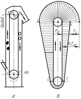 то при указанной разности диаметров и скорость будет больше . Разность в скоростях может составлять (3…5) %, что сопоставимо с удлинением ленты под воздействием тягового усилия. Большая скорость на поверхности барабана 13 позволяет компенсировать упругую деформацию (удлинение) ленты, обеспечивает дополнительное прижатие ленты к барабану 3 с необходимым увеличением тягово-сцепных свойств привода. Суммарный угол обхвата лентой барабанов 3 и 13 не превышает 190о