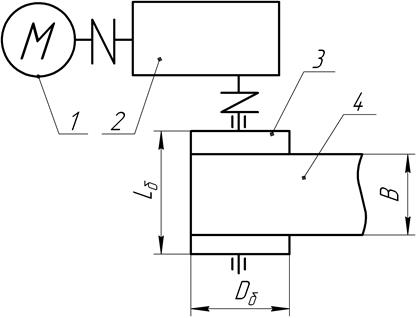 Привод (рисунок 5.2, а)содержит два двигателя 1, два редуктора 2, барабан 3 (один из трех) и ленту 4. Двигатель 1 прифланцован к редуктору 2. Тихоходный вал редуктора выполнен полым с шлицевым соединением вала барабана.