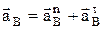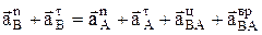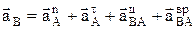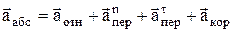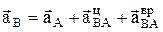 Рассмотрим движение точки В как сложное, считая ее движение по дуге окружности относительным, а вращение пластины – переносным движением. Тогда абсолютная скорость и абсолютное ускорение точки найдутся по формулам: ,
