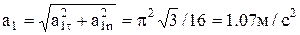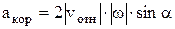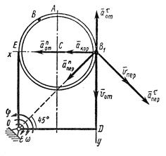 3. Кориолисово ускорение. Модуль кориолисова ускорения определяем по формуле , где a — угол между вектором и осью вращения (вектором ). В нашем случае этот угол равен 90°, так как ось вращения перпендикулярна плоскости пластины, в которой расположен вектор .