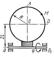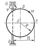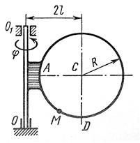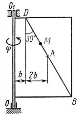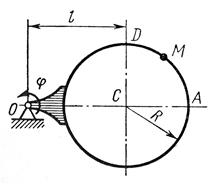 D (ОЕ = OD, рис. К4а) вращается вокруг оси, проходящей через точку О перпендикулярно плоскости пластины, по закону (положительное направление отсчета угла показано на рис. К4а дуговой стрелкой). По дуге окружности радиуса R движется точка В по закону (положительное направление отсчета s — от А к В).