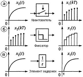 Форма представления и способ обработки информации определяют основную особенность работы цифровых систем и методов синтеза цифровых регуляторов. Дискретный характер сигналов в управляющей ЭВМ вызывает необходимость использования дискретных алгоритмов управления, которые могут быть построены преобразованием соответствующих непрерывных регуляторов. Вместе с тем использование ЭВМ в контуре обратной связи приводит к целому ряду особенностей цифровой системы, обусловленных спецификой взаимодействия ее функциональных элементов, а для построения аналитической модели цифровой системы необходимо принимать во внимание аппаратные средства системы и процессы обмена информацией между ними.